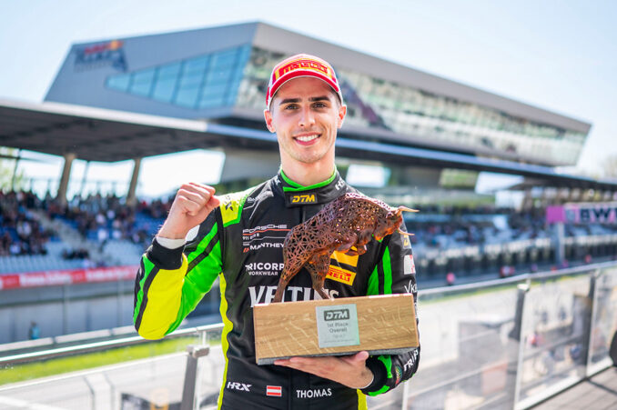 Eine kluge Strategie und starke Nerven waren der Schlüssel zum Erfolg: Thomas Preining (A/Manthey) hat am Samstag nach einer fehlerlosen Vorstellung zum zweiten Mal sein DTM-Heimrennen auf dem Red Bull Ring gewonnen. Beim Auftaktrennen in der Steiermark überquerte der Porsche-Werksfahrer nach 38 Runden als Erster die Ziellinie und feierte damit seinen neunten DTM-Erfolg.