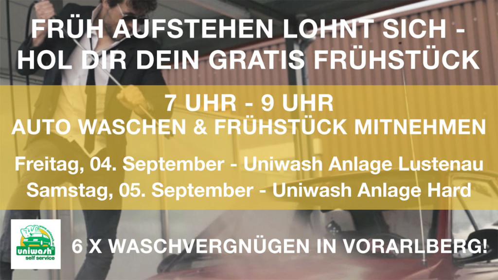 Von heute Montag (Anlage Bludenz-Bürs) bis zum Samstag (Anlage Hard) lädt uniwash zur morgentlichen Primetime in die 6 uniwash -Waschanlagen in Vorarlberg. Wer zwischen 07 Uhr und 09 Uhr sein Auto wäscht, kriegt als Morgengruß das Frühstück gleich mit zur Arbeit oder nach Hause. Einfach Autowaschen und Frühstück mitnehmen.
