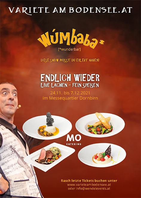 Im heurigen Programm „WUMBABA“ (sprich wunderbar!) wechseln spektakuläre Artistik-und Musik-Darbietungen mit Momenten grandioser Komik. Dazwischen serviert ein motiviertes MO-Catering-Team ein raffiniert abgestimmtes 3-Gang-Menü!
