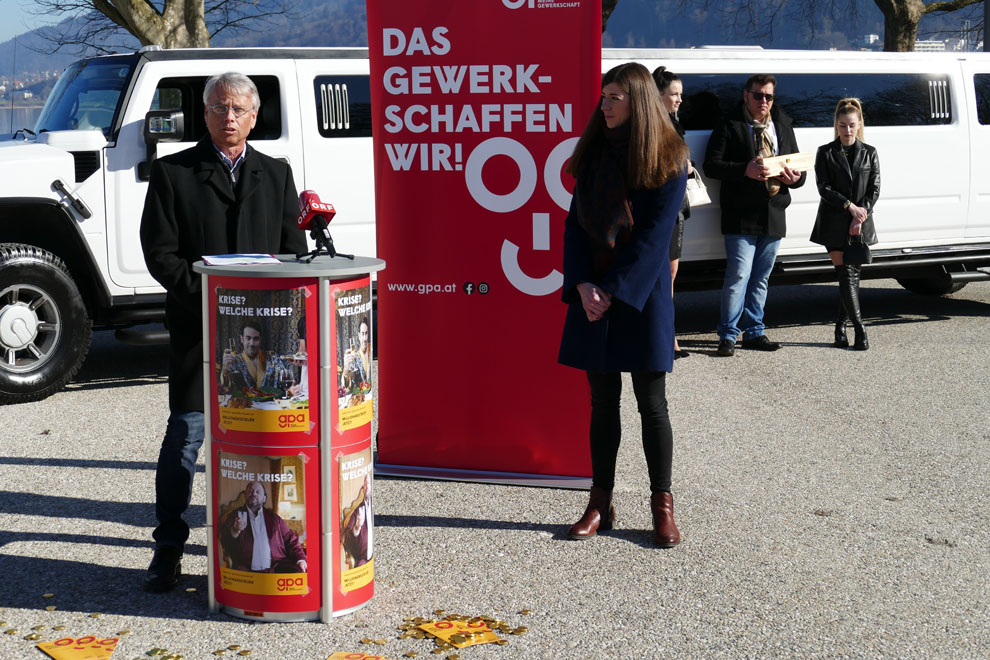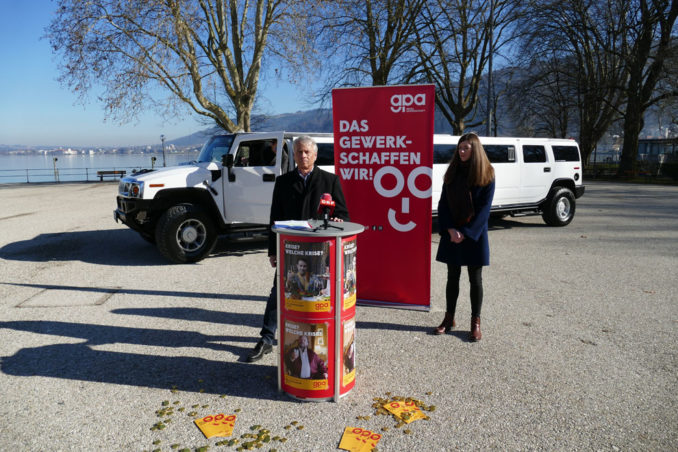 Fritz Dietrich, GPA Landesvorsitzender Vorarlberg und Jessica Lutz, GPA und Frauenvorsitzende Vorarlberg präsentierten Daten und Fakten zu den Themen Vermögensverteilung, Erbschaften und Verteilung der Kosten der Corona-Krise.