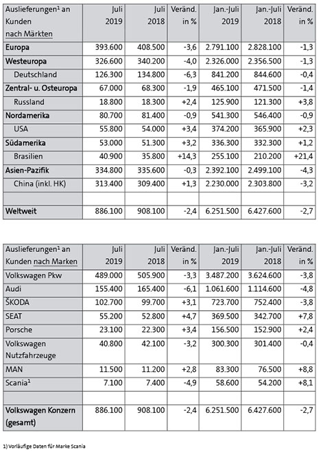 Die Auslieferungen des Volkswagen Konzerns sanken im Juli um 2,4 Prozent gegenüber dem Vorjahresmonat auf 886.100 Fahrzeuge. In Europa kam es zu einem Rückgang um 3,6 Prozent auf 393.600 Fahrzeuge. Diese Entwicklung war erwar-tet worden, da die Auslieferungen im Vorjahresmonat durch die WLTP-Umstellung auf be-sonders hohem Niveau gelegen hatten. In den Regionen Nordamerika (-0,9 Prozent) und Asien-Pazifik (-0,3 Prozent) lagen die Auslieferungen leicht unter dem Niveau des Vorjahresmonats. Südamerika (+3,2 Prozent) entwickelte sich im Vorjahresvergleich positiv. Dr. Christian Dahlheim, Leiter Volkswagen Konzern Vertrieb: „Der Volkswagen Konzern ist solide ins zweite Halbjahr gestartet und hat in einem rückläufigen weltweiten Gesamtmarkt seinen Marktanteil erneut leicht ausgebaut. Besonders erfreulich ist, dass wir in unserem wichtigsten Markt China entgegen der Abwärtstendenz des Marktes zugelegt haben.“