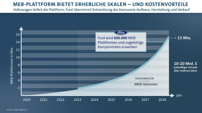 Die Nutzung der MEB-Plattform von Volkswagen durch Ford in Europa ist zudem ein wichtiger Eckpfeiler in der Elektromobilitätsstrategie von Volkswagen und unterstützt die Anstrengungen beider Unternehmen, die Ziele des Pariser Klimaabkommens von 2015 zu erreichen. Volkswagen und Ford wollen zudem weitere Möglichkeiten der Zusammenarbeit bei Elektrofahrzeugen prüfen.