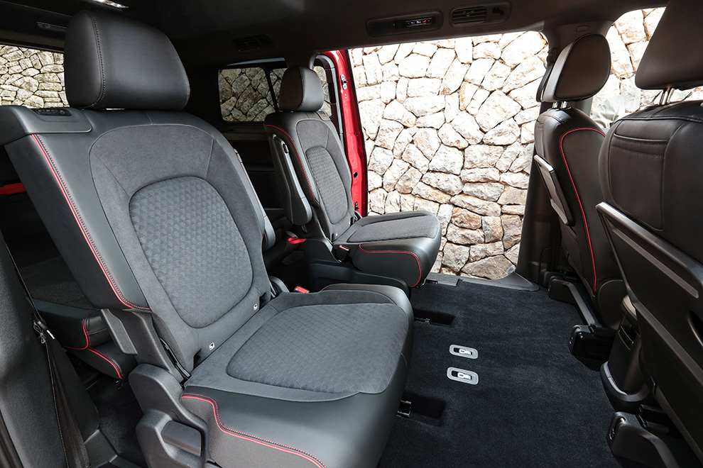 Individualisiert wurde von Volkswagen Nutzfahrzeuge auch die Innenausstattung. Dunkle Farbtöne unterstreichen dabei den sportlichen Charakter der stärksten ID. Buzz Modelle. So sind beide ID. Buzz GTX Versionen – mit kurzem wie auch mit langem Radstand – als einzige Modelle der Baureihe mit einem schwarzen Dachhimmel ausgestattet. Im spezifischen GTX-Design wurde auch die Sitzanlage konzipiert. Vorne kommen elektrisch einstellbare Komfortsitze mit Memory-Funktion zum Einsatz. Veredelt wird die Sitzanlage durch Bezüge im schwarzen Mikrovlies „ArtVelours Eco“ mit einer neuen Rauten-Musterung sowie roten Kontrastnähten und roten Biesen. Rote Kreuznähte kennzeichnen indes das Multifunktionslenkrad; es wird zudem durch eine rote Applikation der Mittelspange und den dort in Chrom integrierten GTX-Schriftzug veredelt.